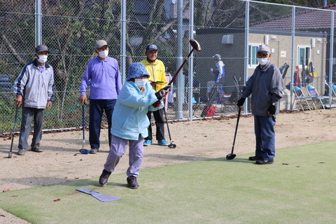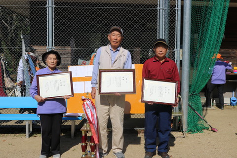 公開日 2020年10月27日 10月24日に、村内外から3団体76人の参加をいただき、ふれあいグラウンドにて開催しました。 秋晴れのもと、熱戦が繰り広げられるとともに参加者の親睦が図られました。 大会結果 優 勝 山根 靖治(石井仲良し会) 準優勝 安芸 重美(佐那河内G.G) 第3位 松下 秀治(佐那河内G.G) 優勝:山根さん(中) 準優勝:安藝さん(左) 第3位:松下さん(右) プレーを楽しむ様子