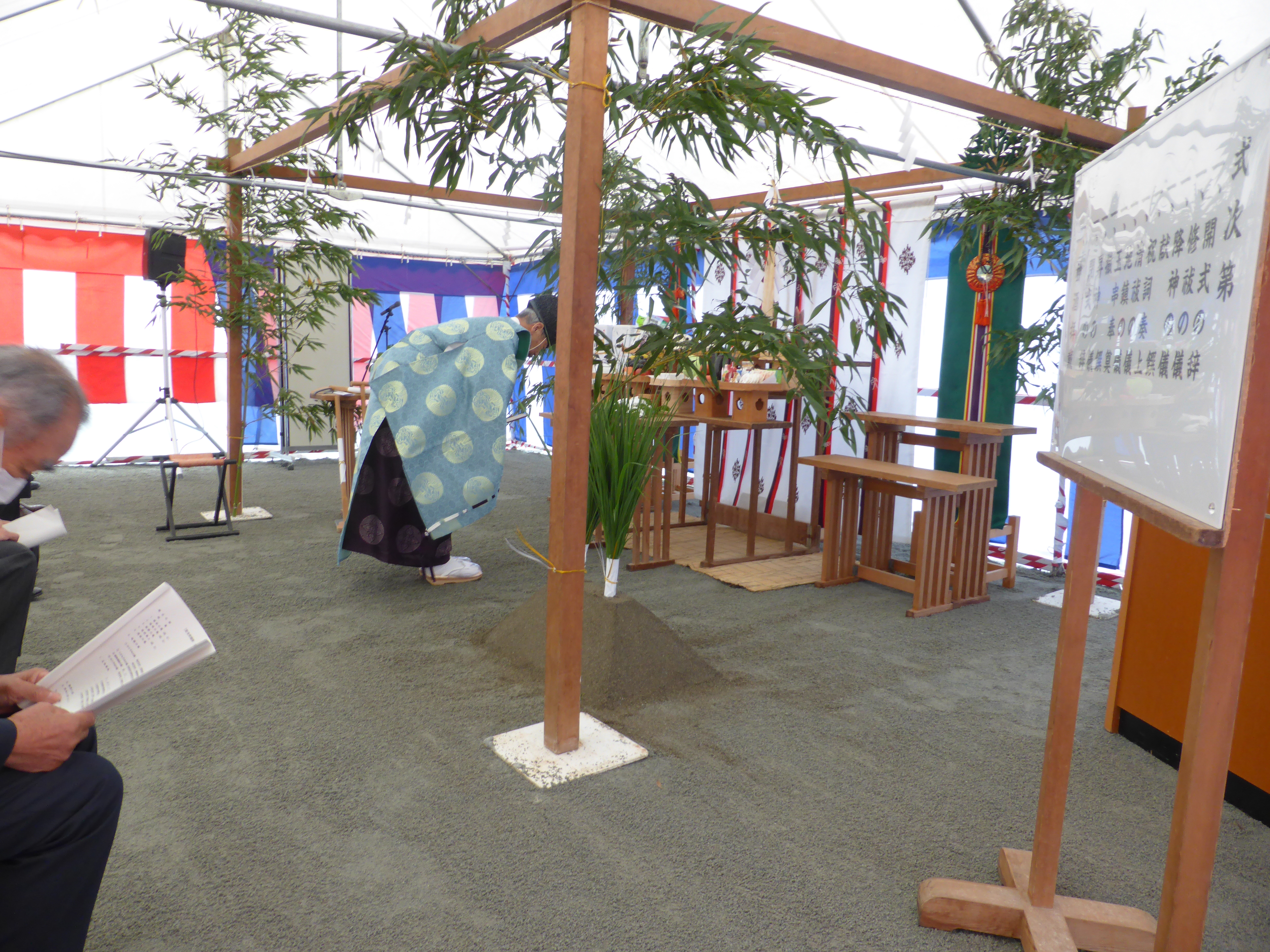 村議会議員、村教育長職務代理者、村消防団長、佐那河内郵便局長、村職員の他、工事関係者の29人が出席し、大宮八幡神社 井開充祥宮司を斎主として、神事が滞りなく執り行われ、工事が事故なく安全にかつ工期内に完成することを祈願しました。